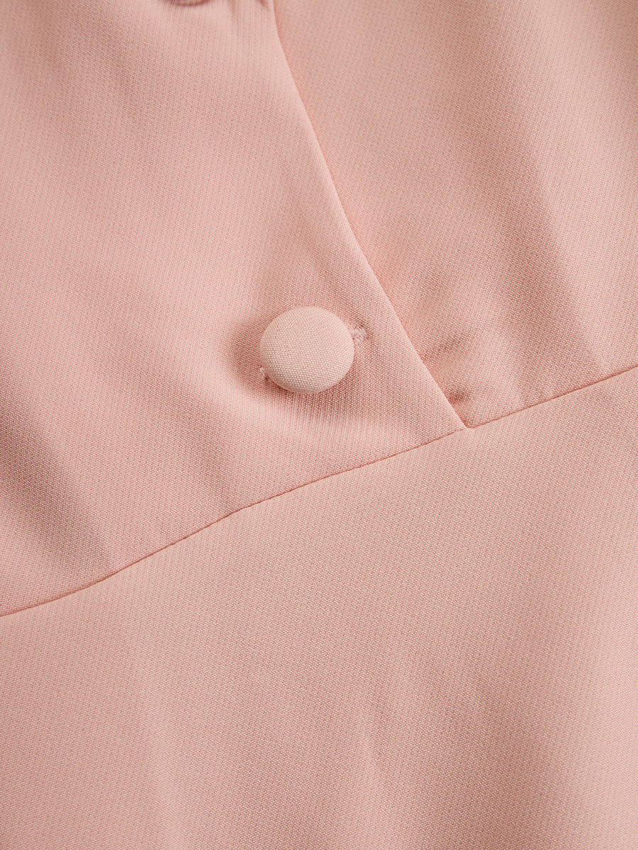 This blush pink midi dress redefines elegance with a modern, tailored edge. Designed with the sharp sophistication of a blazer and the feminine charm of a flared skirt, it delivers the perfect fusion of structure and grace. The bodice features a deep V neckline framed by wide lapels, enhanced by a sleek double-button closure that accentuates the waistline.